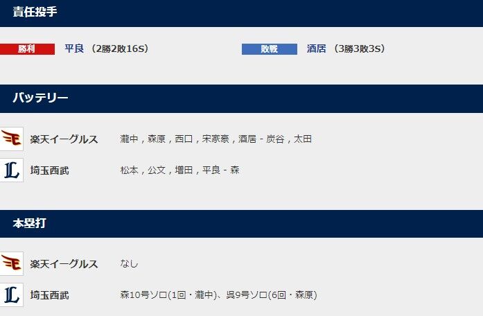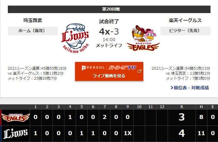 2021.9/23-試合結果【西武×楽天】(メットライフドーム)は4-3で西武が勝ち!!森&呉がホームラン!!9回に代打柘植のタイムリーで西武今季初のサヨナラ勝ち!! 2021年09月23日 カテゴリ:西武ライオンズの試合結果 【西武4-3楽天】(出典 yahoo)<試合結果詳細>(出典 埼玉西武ライオンズオフィシャルサイト)<試合ダイジェスト><パリーグ順位表>(出典 yahoo)1 風吹けば名無し :2021/09/23(木) 17:17:30.58 ID:Vt892Y8O0.netうおおおおおおおおおおおおおおおおおおおおお(出典 柘植! 西武ファン集合) 続きを読む タグ :#試合結果#埼玉西武ライオンズ#seibulions#れおほー