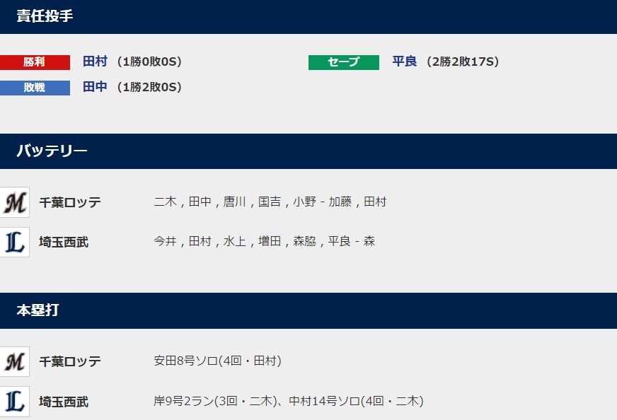 2021.9/24-試合結果【西武×ロッテ】(メットライフドーム)は5-4で西武が勝ち!!岸と中村がホームラン!!田村がプロ初勝利!西武、連勝!! 2021年09月24日 カテゴリ:西武ライオンズの試合結果 【西武5-4ロッテ】(出典 yahoo)<試合結果詳細>(出典 埼玉西武ライオンズオフィシャルサイト)<試合ダイジェスト><パリーグ順位表>(出典 yahoo)16 風吹けば名無し :2021/09/24(金) 21:27:47.43 ID:y0qH6yC00.net田村良かったなあ(出典 埼玉西武ファン集合!) 続きを読む タグ :#試合結果#埼玉西武ライオンズ#seibulions#れおほー