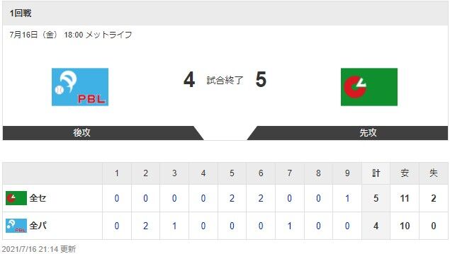 2021.7/16-オールスター第1戦【パリーグ×セリーグ】は4-5でパリーグが負け・・・2回に山川のタイムリーでパリーグが先制し、3回にレアードがホームランを打ちリードするが負ける 2021年07月17日 カテゴリ:西武ライオンズの試合結果パ・リーグ 【パリーグ4-5セリーグ】(出典 yahoo)227 風吹けば名無し (ワッチョイ 9dbb-kbnc) :2021/07/16(金) 20:51:15.22マケタデー(出典 【テレ朝系,AbemaTV】マイナビオールスターゲーム2021 第1戦 ★26【戦犯佐野】) 続きを読む タグ :#試合結果#オールスターゲーム#パリーグ#セリーグ